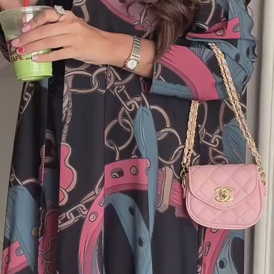- Un Imprimé Signature : Le motif chaînes et sangles en rose, bleu ardoise et gris sur fond noir est reconnaissable au premier regard. Tu ne te fondras pas dans la masse — tu définis le style.