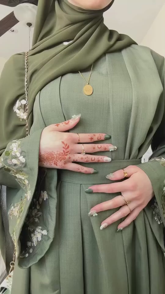 La pièce principale dessine une abaya longue en lin, à la ligne droite et enveloppante. Au bas des manches, un travail de broderie florale vient se déposer comme une bordure végétale : tiges fines, petites fleurs claires, touches de vert qui se détachent avec discrétion sur le fond. Le voile assorti reprend ces motifs par touches, comme si quelques pétales s’étaient posés sur l’étoffe.