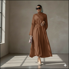 La robe intérieure dessine une colonne nette, marquée à la taille par un drapé noué qui crée un pan central élégant. Sur le buste, un semis de petites perles vient accrocher la lumière, sans surcharge, simplement comme une pluie ponctuelle sur le tissu. Par-dessus, le manteau long ouvert reprend exactement la même teinte et encadre l’ensemble dans une ligne droite, aux manches larges et régulières. Le voile assorti termine la silhouette en continuité, sans rupture de couleur.