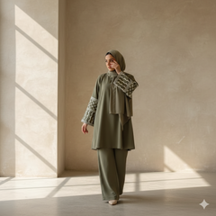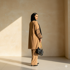 Porté avec un foulard ton sur ton ou en contraste noir, Héritage Palestinien s’installe naturellement dans le vestiaire : un ensemble 2 pièces que l’on choisit autant pour son confort que pour ce qu’il raconte, avec des lignes nettes, des manches de caractère et une allure maîtrisée, du quotidien aux moments plus marquants.
